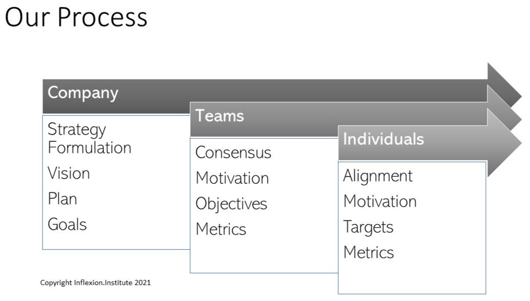 Consultants help formulate strategy.Coaches hone individual managers' skills.But there remains a large gap between your strategy and its implementation by teams and individuals.All too often, strategy fails to break out of the C-Suite, while coaching remains generic and un-informed by strategy.What if your strategy and its implementation could be aligned by design?For a successful strategic implementation, strategy must be people-focused: it must become real to the teams and individuals who carry it out.Inflexion.Institute works with the C-Suite and with management teams to connect strategy rollout and implementation follow-through.We stick around to get the job done.